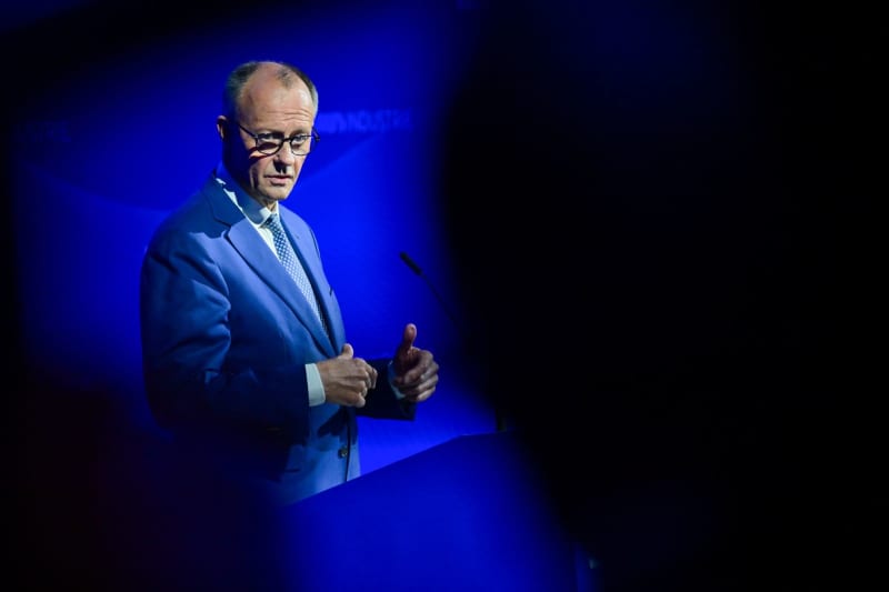 يتحدث المستشار الألماني فريدريتش ميرز خلال يوم صناعة البناء في برلين Euref-Campus. سيباستيان كريستوف جولنو/DPA
