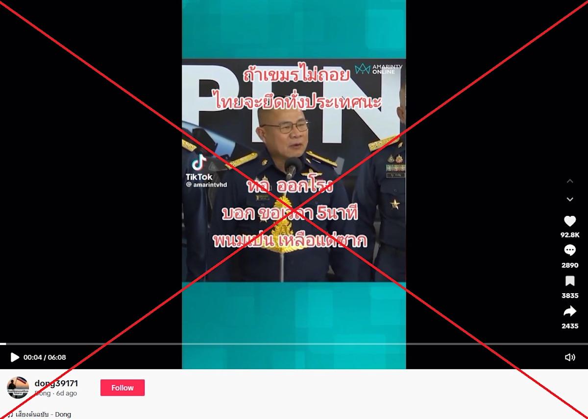 يقرأ النص باللغة التايلاندية المتراكمة على المقطع: “إذا لم تتراجع كمبوديا ، فسوف تستولي تايلاند على البلاد تمامًا. يقول القوات الجوية إن بنوم بنه يمكن تخفيضه إلى أنقاض في غضون 5 دقائق.”