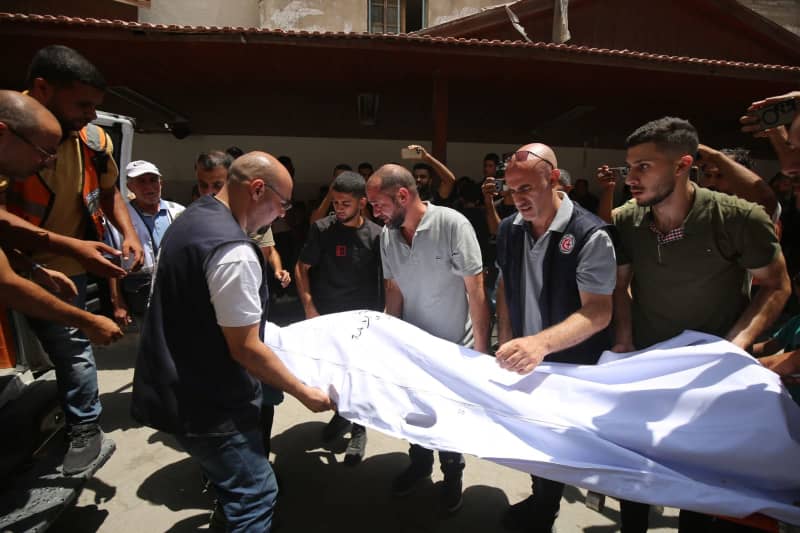 يأخذ المشيعون الفلسطينيون جثة أحد أفراد أسرته لدفنه من Ahli العربي في المدينة ، والمعروف أيضًا باسم مستشفى المعمدانيين ، في أعقاب ضربة إسرائيلية سابقة على كنيسة العائلة المقدسة. عمر Ashtawy/APA عبر Zuma Press Wire/DPA