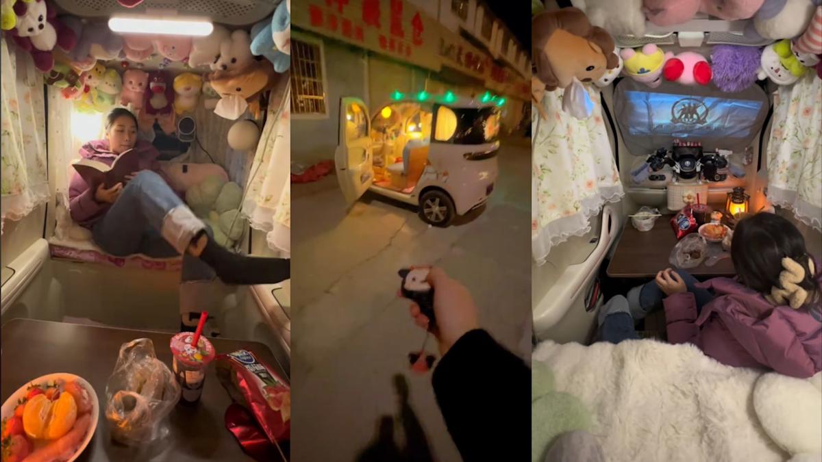 من الخارج ، تبدو رحلتها مثل أي سيارة Kei التي قد تراها في اليابان أو أجزاء أخرى من حافة المحيط الهادئ. ولكن بمجرد أن تفتح الباب ، يمكنك أن ترى أن الجزء الداخلي يتم تزيينه بالحيوانات الصغيرة المحشوة ، والأضواء على السطح ، وأضواء إضافية في الداخل ، والوسائد ، والستائر ، وطاولة قابلة للطي ، وسرير مرتجل. هناك سخان محمول للأوقات الباردة من العام ، لكننا لا نعرف ماذا تفعل بمجرد أن تصبح ساخنة في الصيف.