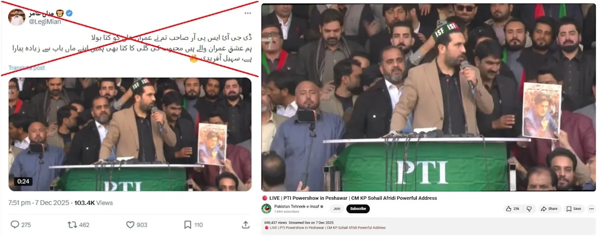 مقارنة لقطة الشاشة للفيديو الذي تمت مشاركته بشكل زائف (L) وفيديو PTI من 7 ديسمبر 2025