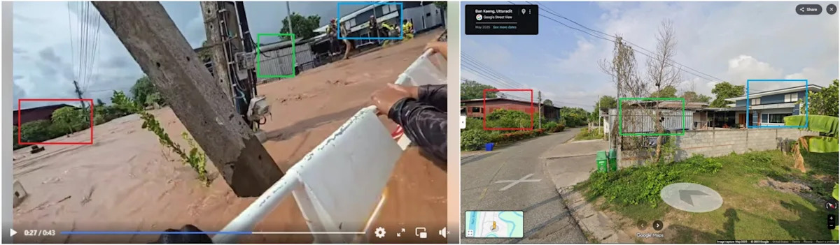 مقارنة لقطة شاشة للفيديو من المجموعة الخيرية (يسار) مع صورة Google Street View مع أوجه التشابه التي أبرزتها وكالة فرانس برس