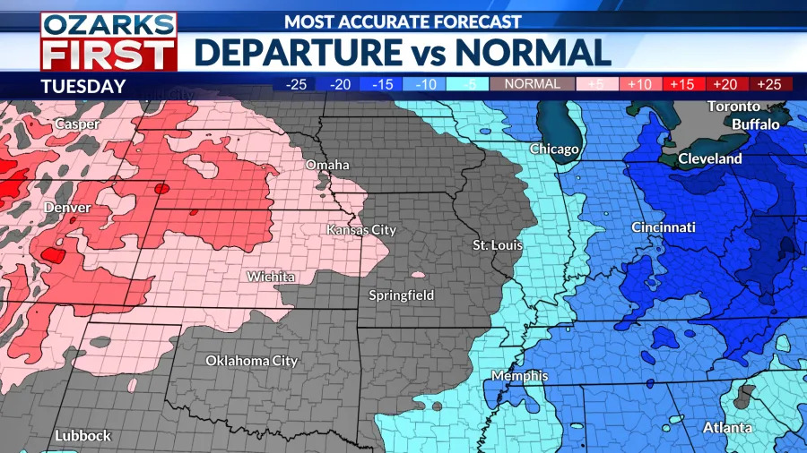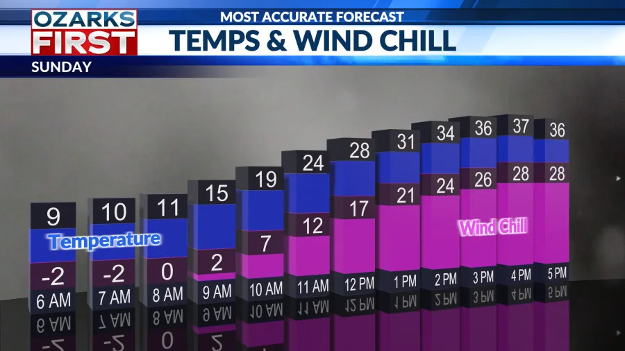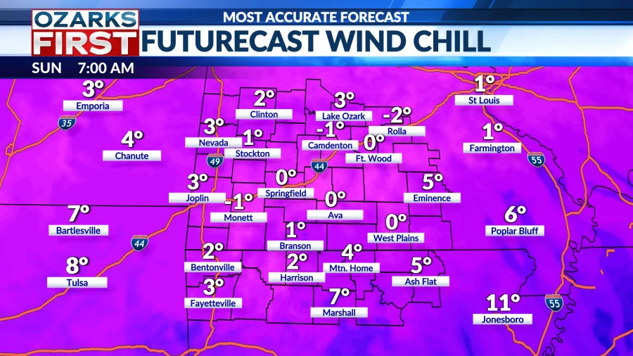 كتلة هوائية قطبية تستعيد نشاطها يوم الاثنين. سوف يتدفق الهواء البارد إلى أوزاركس بمناسبة يوم MLK، مع بقاء درجات الحرارة في العشرينات وانخفاض قشعريرة الرياح إلى خانة الآحاد.