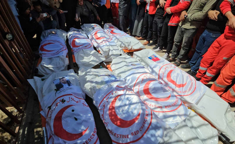 وقالت خدمة الإنقاذ إن الجيش الإسرائيلي هاجم سيارة إسعاف ومحرك إطفاء في مدينة رافا في غزة الجنوبية في 23 مارس. تم استرداد جثث 14 من الرجال من مقبرة جماعية بعد سبعة أيام.