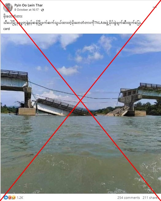وقال المجلس العسكري الحاكم في ميانمار في أكتوبر 2025 إنه استعاد السيطرة على بلدة تقع على الطريق التجاري السريع المؤدي إلى الصين من جماعة مسلحة عرقية. وزعمت منشورات على الإنترنت ظهرت أثناء القتال كذباً أن جسراً رئيسياً تعرض لأضرار بالغة. ومع ذلك، فإن الصورة التي شاركوها تصور معبرًا تم تدميره قبل عام في ولاية تبعد مئات الكيلومترات.