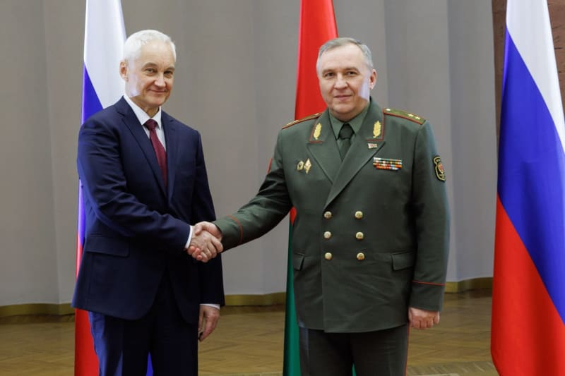 يلتقي وزير الدفاع الروسي بيلوسوف (L) بنظيره البيلاروسي فيكتور خرينين. ذكرت وكالة الدولة البيلاروسية بيلتا يوم الجمعة أن روسيا وبيلاروسيا تستعدان لمناورة عسكرية جديدة كبيرة. Vadim Savitsky/Tass عبر Zuma Press/DPA