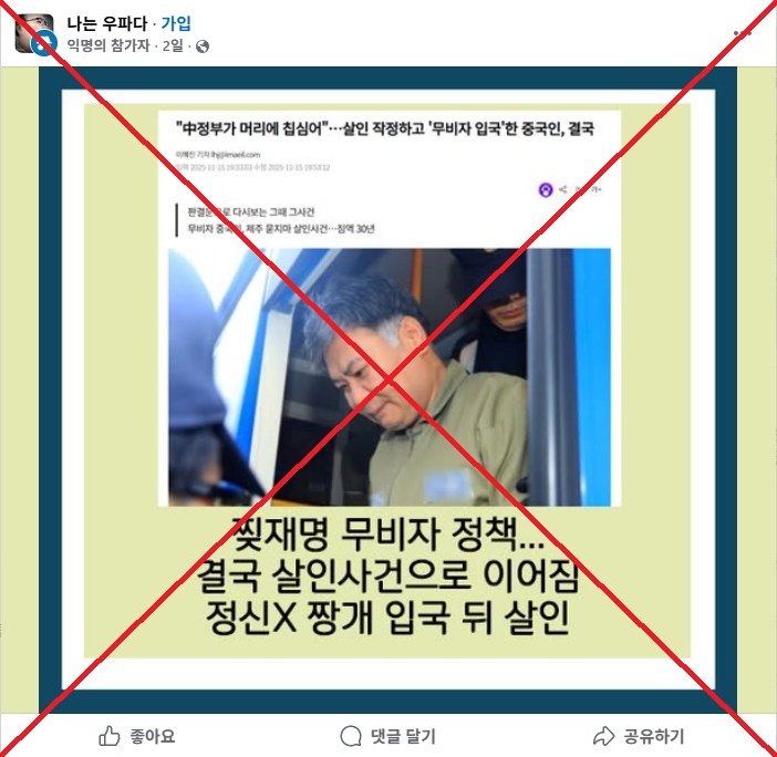 “سياسة الإعفاء من التأشيرة التي اتبعها Lee Jae Myung… انتهت بالتسبب في جريمة قتل”، هذا ما جاء في نص باللغة الكورية على رسم بياني على Facebook تمت مشاركته في 21 نوفمبر 2025.