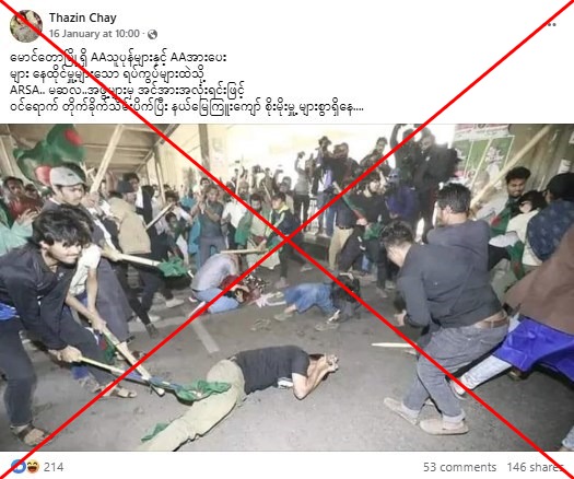 استمرت الصور التي تم تمثيلها في الدوران على وسائل التواصل الاجتماعي حول الاضطرابات في ولاية راخين الغربية في ميانمار التي تنطلق من الانقسامات العرقية والدينية. شاركت منشورات البورمية على Facebook في يناير صورة لمشاجرة عنيفة ، ودعوا زوراً أن المقاتلين يهاجمون مجموعة متمردة منافسة تتحكم في أجزاء كبيرة من راخين. في الواقع ، تم تصوير الصورة في بنغلاديش وتظهر شجارًا أثناء الاحتجاج ، وهو المصور الذي أخذها أخبرت وكالة فرانس برس.