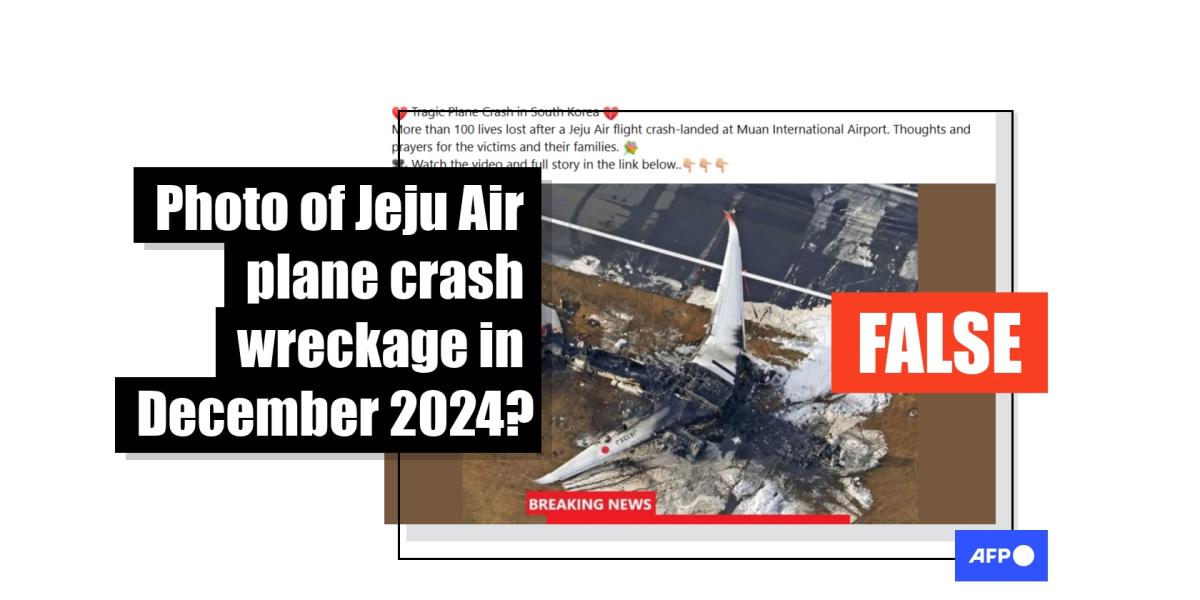 بعد ساعات من تحطم طائرة تابعة لشركة طيران جيجو واشتعلت فيها النيران، مما أسفر عن مقتل 179 شخصًا كانوا على متنها في أسوأ كارثة طيران على الأراضي الكورية الجنوبية، تم تداول صورة لجسم الطائرة المحترق في منشورات على وسائل التواصل الاجتماعي زعمت كذبًا أنها تظهر الحطام. . وتظهر الصورة في الواقع بقايا طائرة الخطوط الجوية اليابانية التي اشتعلت فيها النيران بعد اصطدامها بطائرة لخفر السواحل في يناير 2024.
