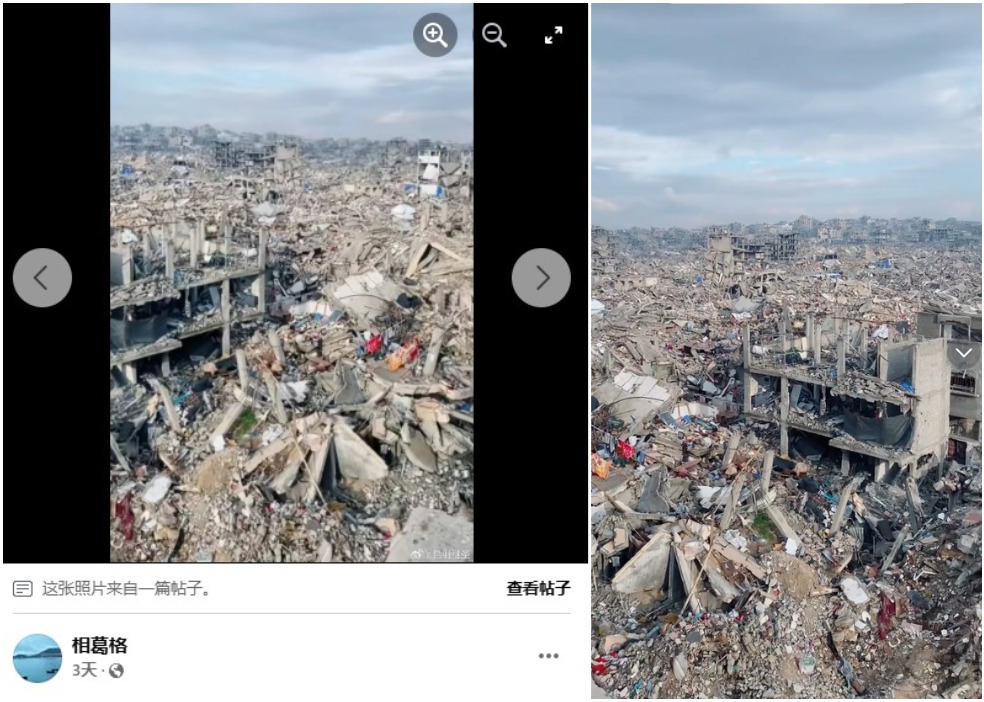 ومع ذلك ، أدى البحث عن الصورة العكسية عن الصورة الأولى في المنشور إلى فيديو Tiktok مشترك في 20 فبراير من قبل مستخدم مقره في غزة. يُظهر المقطع نفس الشيء المدمر مبنى (الرابط المؤرشفة).
