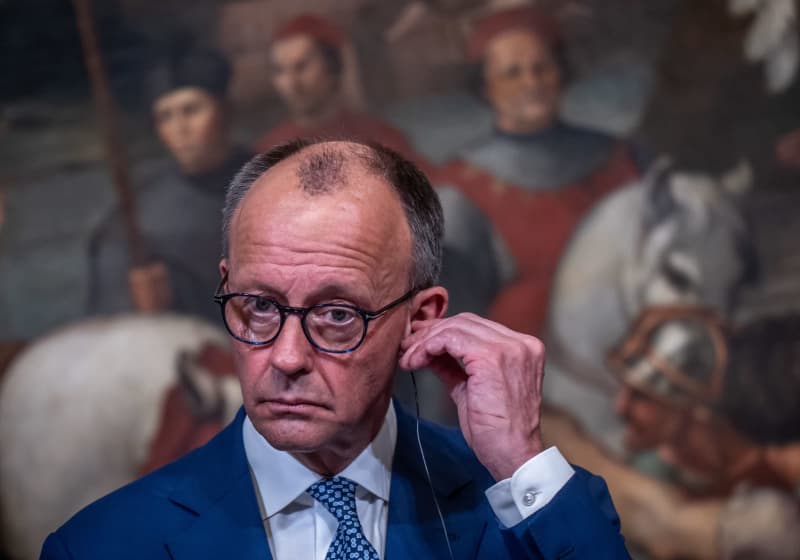 يتحدث المستشار الألماني فريدريش ميرز خلال مؤتمر صحفي مع رئيس الوزراء الإيطالي جورجيا ميلوني بعد اجتماعهم. مايكل كابيلر/DPA