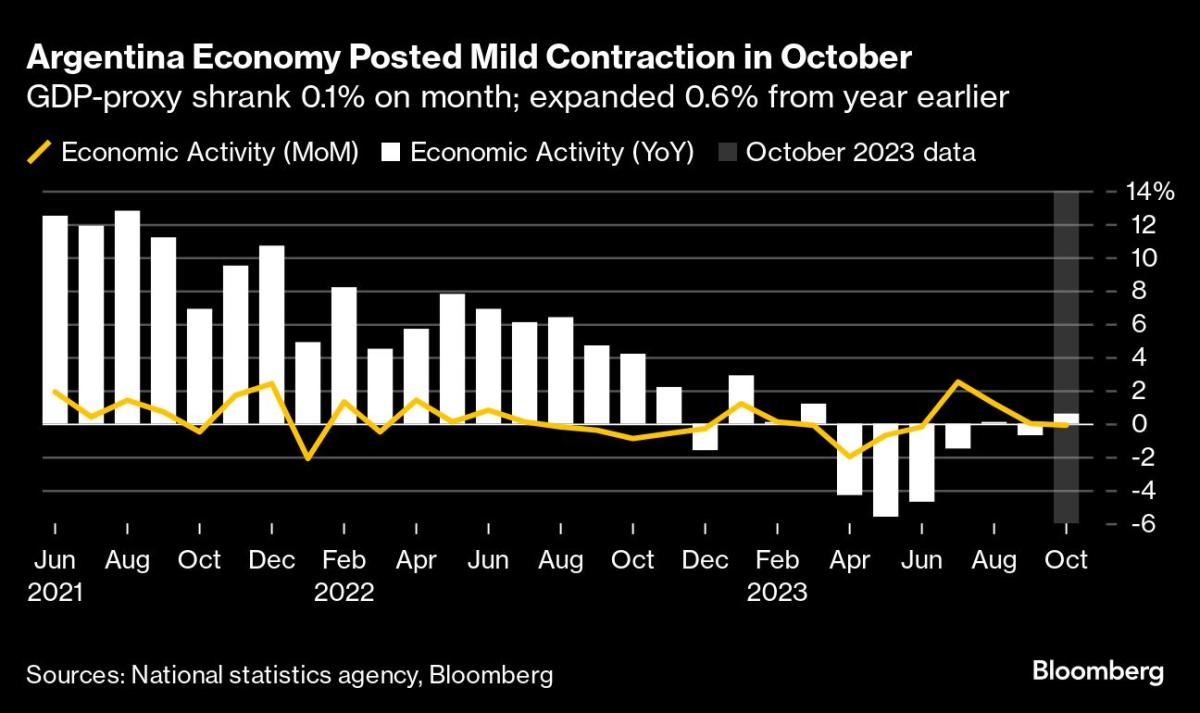 (بلومبرج) – سجل الاقتصاد الأرجنتيني انكماشًا طفيفًا في أكتوبر على الرغم من دورة الانتخابات الرئاسية المضطربة التي أثارت حالة من عدم اليقين بشأن السياسات وعمليات بيع أخرى للعملة في الأسواق الموازية.