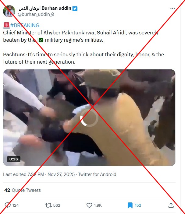 “رئيس وزراء خيبر بختونخوا، سهيل الفريدي“تعرض للضرب المبرح على يد مليشيات النظام العسكري”. تمت مشاركة منشور X في 27 نوفمبر، 2025، خطأ إملائي في الاسم حليف خان ورئيس المقاطعة الشمالية الغربية Cالوزير الكبير سهيل أفريدي.