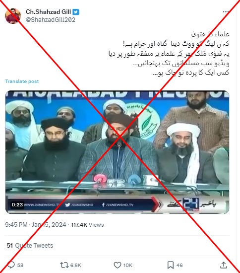 ظهر مقطع فيديو تم تصويره في عام 2017 يظهر علماء دين يدعون الباكستانيين إلى عدم التصويت لحزب الرابطة الإسلامية الباكستانية – نواز (PML-N) إلى الظهور في سياق مضلل قبل الانتخابات الرئاسية. انتخابات في فبراير 2024. تم إجراء المكالمة في الواقع بعد استدعى حزب الرابطة الإسلامية الباكستانية – ن الجيش للتعامل مع الاحتجاج في ذلك الوقت. وقال الرئيس السابق لنادي الصحافة في فيصل آباد، حيث تم تصوير الفيديو، لوكالة فرانس برس إن المقطع يظهر مؤتمرا صحفيا عقد في تشرين الثاني/نوفمبر 2017 ردا على حملة القمع.