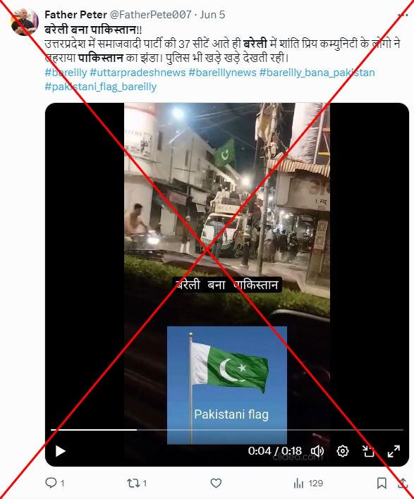 تمت مشاركة مقطع فيديو لعلم ديني فوق شاحنة في منشورات زعمت كذباً أن سكان مدينة باريلي في ولاية أوتار براديش الهندية لوحوا بعلم باكستان ذات الأغلبية المسلمة للاحتفال بفشل حزب بهاراتيا جاناتا القومي الهندوسي في تأمين الأمن. الأغلبية في الولاية بعد الانتخابات العامة في البلاد. ويختلف العلم الموجود في الفيديو عن العلم الوطني لباكستان، وتم تداول الفيديو عبر الإنترنت قبل أسابيع من إعلان نتائج الانتخابات الوطنية الماراثونية في الهند.
