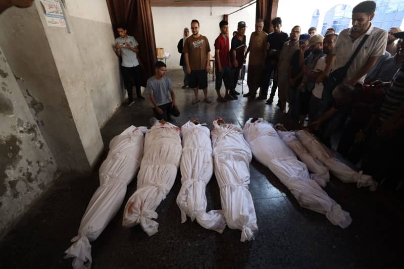 رجل يحمل مجموعة من الفلسطينيين ، الذين قتلوا في هجوم إسرائيلي على عائلة شريعة في منزل أبو تقع في حي سابرا في مدينة غزة الجنوبية. عمر Ashtawy/APA عبر Zuma Press Wire/DPA