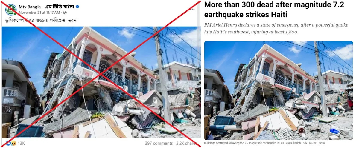 بعد وقوع زلزال قوي خارج العاصمة المزدحمة دكا في بنجلاديش في 21 نوفمبر، تم تداول الصور في منشورات تزعم كذبًا أنها تظهر المباني المدمرة بسبب الزلزال الذي بلغت قوته 5.5 درجة. في الواقع، تضررت المباني خلال الزلازل المدمرة في نيبال في أبريل 2015، وهايتي في أغسطس 2021، وميانمار في مارس 2025، وظهرت في التقارير الإخبارية في ذلك الوقت.