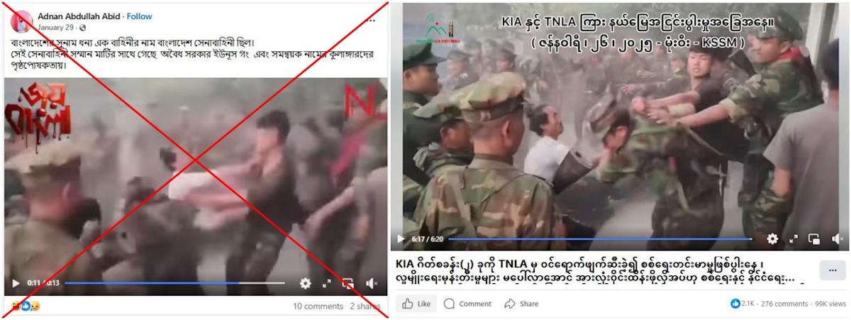 بنغلاديش مددت سلطة مسؤولي الجيش بتكليف في إنفاذ القانون والنظام وسط غياب قوات الشرطة بعد سقوط حكومة الشيخ الحسينة الاستبدادية في 5 أغسطس 2024. لكن لقطات من المشاجرة بين الأشخاص الذين يرتدون تعب بالجيش لا تظهر الجنود ، كما تدعي منشورات وسائل التواصل الاجتماعي ؛ تم تصوير الفيديو في ميانمار ويصور القتال بين مجموعتين عرقيين مسلحين حول النزاعات الإقليمية في شانن شان ولاية.