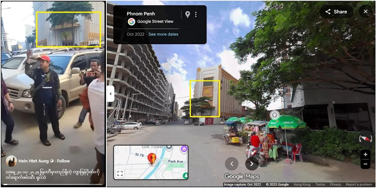 علاوة على ذلك، يتوافق المبنى المرئي في خلفية الفيديو الذي تمت مشاركته بشكل خاطئ مع صور Google Street View من بنوم بنه، والتي تم التقاطها في أكتوبر 2022 (رابط مؤرشف).
