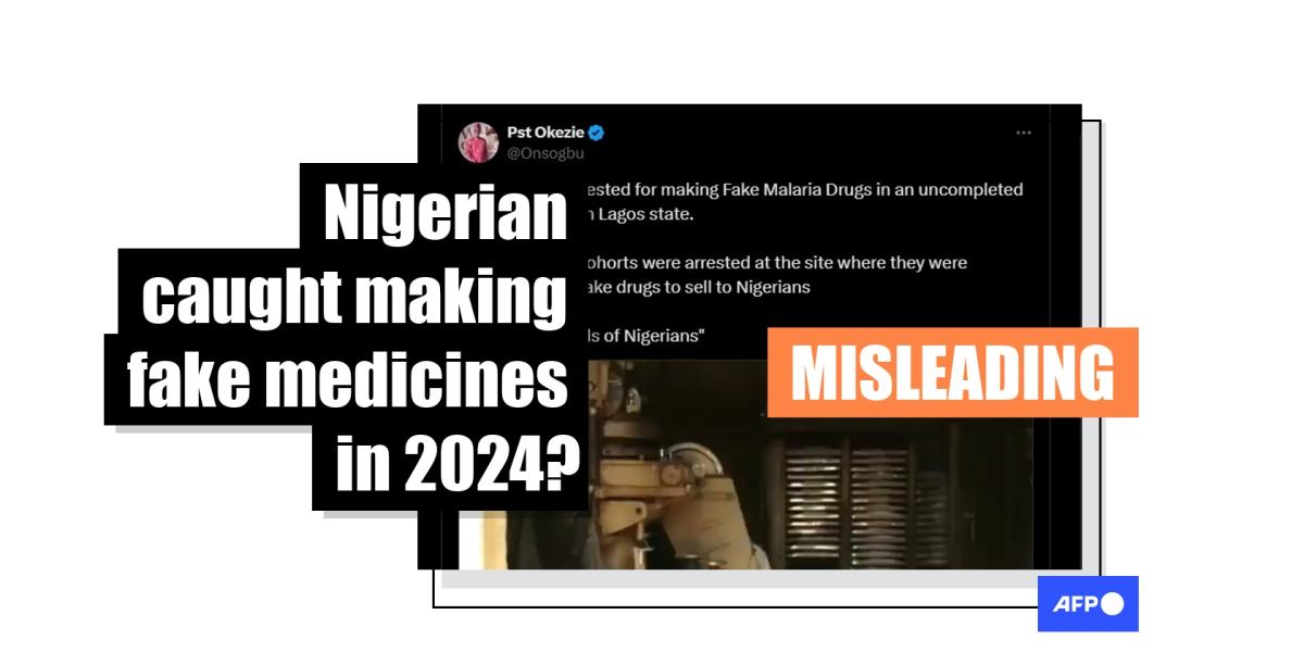 ويظهر في الفيديو شعار Channels Television، وهي مؤسسة إعلامية في نيجيريا. يقول عنوان الأخبار الموجود أسفل الشاشة: “الشرطة تكشف عن مصنع مزعوم للأدوية المزيفة في لاغوس”.