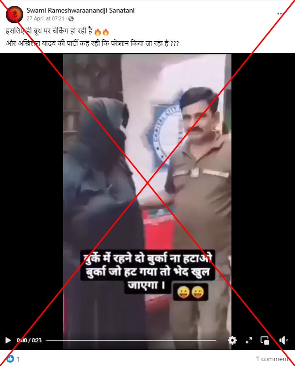 وأكدت الشرطة الباكستانية أنه تم القبض على رجل في مقطع فيديو عبر الإنترنت يرتدي غطاء وجه امرأة مسلمة في عام 2023 بعد أن ارتدى هذا الزي أثناء توجهه إلى الكلية، على عكس منشورات فيسبوك التي زعمت زوراً أنه تنكر في هيئة امرأة لارتكاب تزوير الناخبين في الانتخابات الوطنية الجارية في الهند. وقال متحدث باسم الشرطة إنه تم إيقاف ضابط شرطة في لاهور عن العمل بسبب مقطع فيديو وهو يخلع ملابس الرجل ليكشف عن هويته الحقيقية.