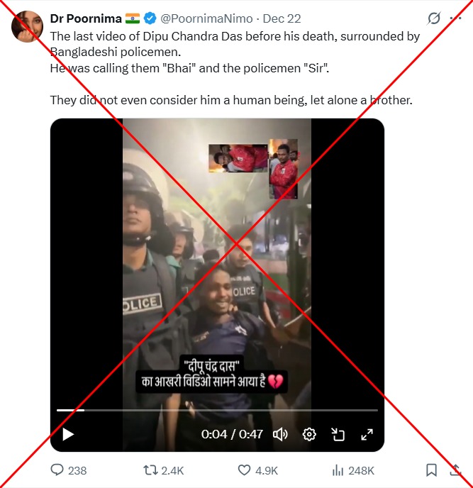 “آخر فيديو لديبو شاندرا داس قبل وفاته، محاطًا برجال الشرطة البنغلاديشيين”، هذا ما جاء في جزء من منشور X تمت مشاركته في 22 ديسمبر 2025.