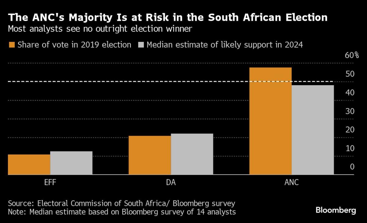 ومن المتوقع أن ينخفض دعم حزب المؤتمر الوطني الأفريقي إلى 48%، من 57% قبل خمس سنوات، وفقًا لمتوسط التقدير لـ 14 محللًا استطلعت بلومبرج آراءهم في الفترة من 26 يناير إلى 2 فبراير، مع توقع اثنين فقط أن الحزب سيفوز بأكثر من 100%. نصف الأصوات. ومن المتوقع أن يحصل حزب المعارضة الرئيسي، التحالف الديمقراطي، على دعم بنسبة 22%، وحزب المناضلون من أجل الحرية الاقتصادية الشعبوي – ثالث أكبر حزب حاليًا – على 12.5%.