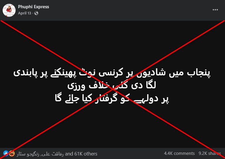 “لقد تم وضع حظر على رمي ملاحظات العملة خلال حفلات الزفاف. سيتم القبض على العريس بسبب انتهاك هذا الحظر” ، كما يقرأ منشور على Facebook باللغة الأردية في 13 أبريل 2025.