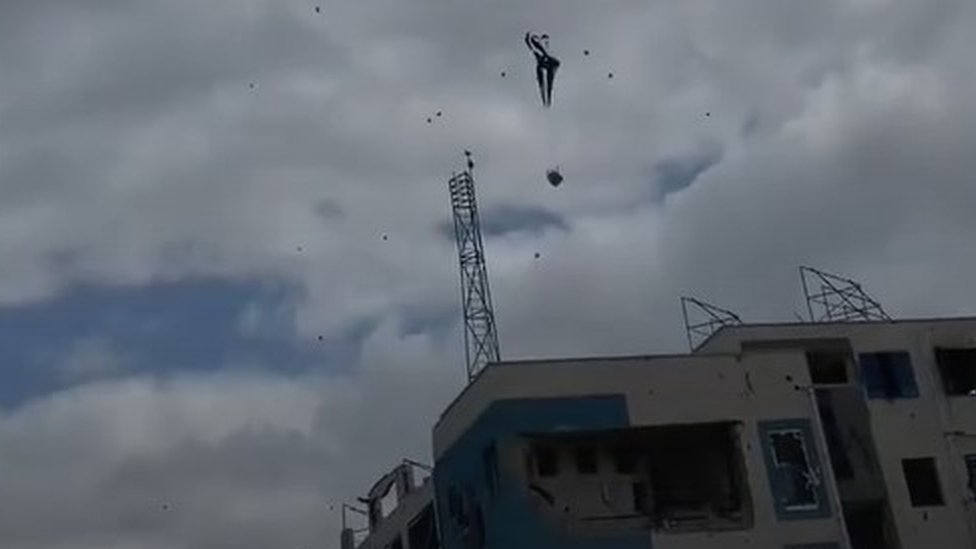 يُظهر مقطع فيديو نُشر على وسائل التواصل الاجتماعي يوم الجمعة وتم التحقق منه بواسطة بي بي سي نيوز، مساعدات تسقط من طائرة شحن من طراز C-17 فوق الشاطئ، شمال مدينة غزة، في منطقة انقطعت إلى حد كبير عن المساعدات في الأشهر الأخيرة.