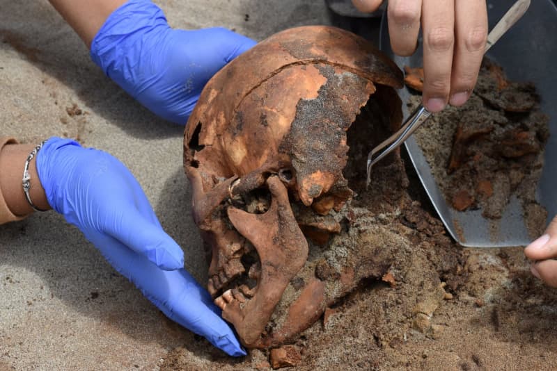 يكشف عالم الآثار عن هيكل عظمي موجود في معبد Puemape ، حيث كشفت الحفريات الأخيرة التي يقودها البرنامج الأثري Chicama عن أدلة قد تعيد تشكيل الفهم للعمارة الطقسية المبكرة وعبادة الأجداد ، في La Libertad ، بيرو ، في صورة البيع هذه التي تم إصدارها على Augus (الائتمان: البرامج الأثرية للشيخاما عن طريق REUTERS)