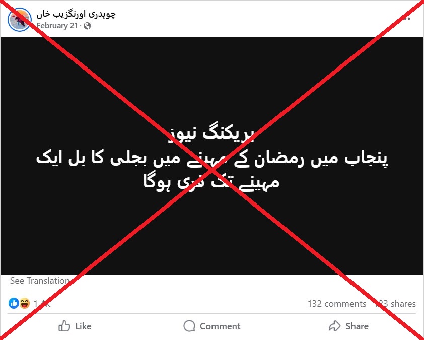 لم تقدم حكومة باكستان الكهرباء المجانية للسكان من أكثر المقاطعات اكتظاظا بالسكان خلال الشهر الإسلامي المقدس من رمضان ، على عكس المطالبات المشتركة على نطاق واسع على وسائل التواصل الاجتماعي. دحض مسؤول في الطاقة الشائعات بينما أخبر أحد سكان البنجاب بشكل منفصل وكالة فرانس برس أنه اتهم لاستخدامه في السلطة في مارس.