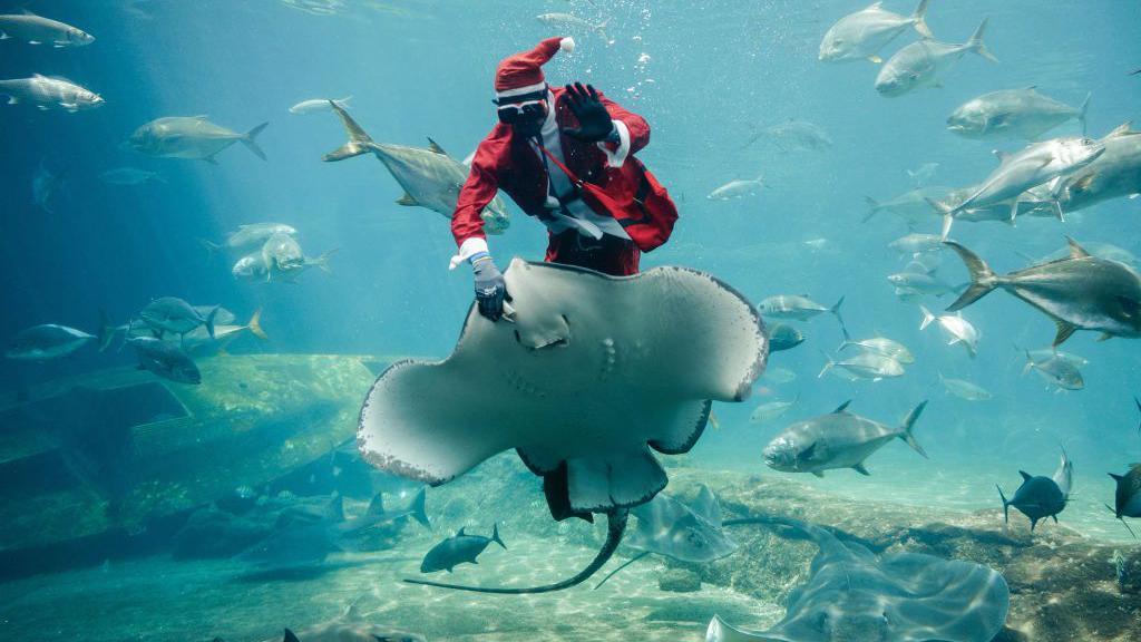 عالم الأحياء المائية من جنوب أفريقيا، مثوبيسي ملامبو، يظهر في صورة سانتا مع سمكة الراي اللساع ذات الذيل الشوكي خلال عرض في أكبر حديقة بحرية في أفريقيا – أوشاكا سي وورلد في ديربان. [Rajesh Jantilal / AFP]
