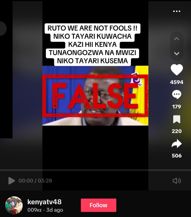 في خطوة لتحصين التحالف الحاكم قبل الانتخابات العامة في كينيا لعام 2027 ، تم دمج وزير الوزراء الرئيسي في مجلس الوزراء موساليا مودافادي (ANC) مع التحالف الديمقراطي التابع للرئيس وليام روتو (UDA). منشور مشترك على مطالبات Tiktok يظهر أنه يهدأ مودافادي بالاستقالة وفضح الجرائم المزعومة من قبل روتو ، مما يعني أن الزعيمين قد سقطوا. المطالبة خاطئة. الفيديو من عنوان عام في عام 2020 عندما تحدث Mudavadi عن عزل حاكم نيروبي السابق مايك سونكو.