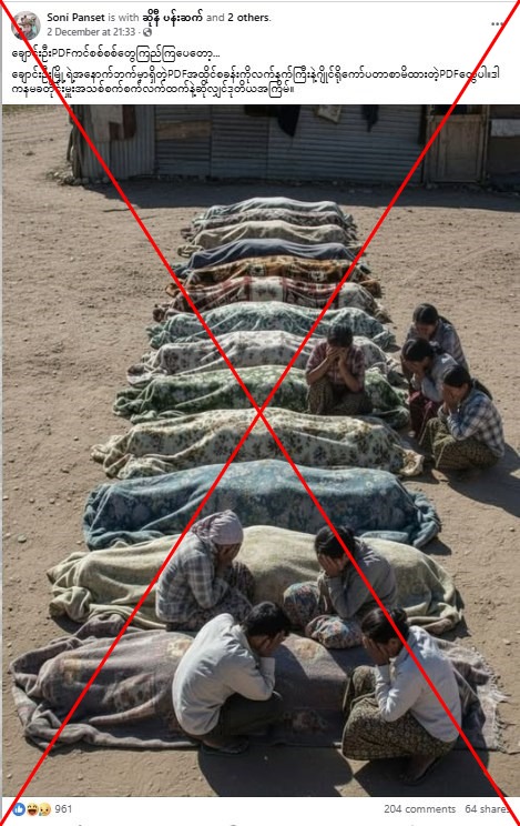 وبينما يشن المجلس العسكري في ميانمار حملة للاستيلاء على الأراضي التي تسيطر عليها الميليشيات المحلية قبل الانتخابات المقرر إجراؤها في أواخر ديسمبر/كانون الأول، تمت مشاركة صورة تم إنشاؤها بواسطة الذكاء الاصطناعي في منشورات على وسائل التواصل الاجتماعي تدعي أنها صورة لقوات متمردة قتلها الجيش. تم وضع علامة على الصورة على أنها تم إنشاؤها باستخدام Google AI وتحتوي على أخطاء مرئية غالبًا ما توجد في المحتوى الذي تم إنشاؤه بواسطة الذكاء الاصطناعي.