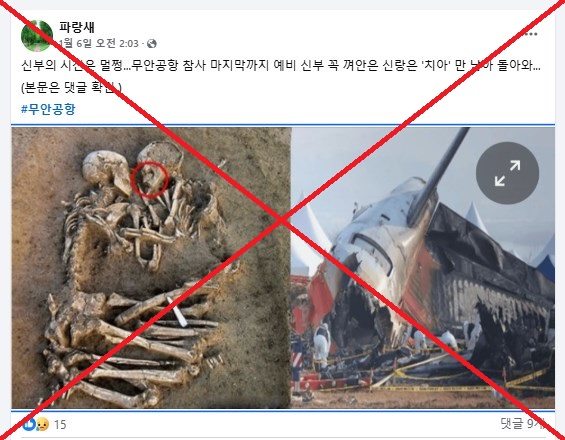 وتضمنت صورة مجمعة تظهر زوجًا من الهياكل العظمية في احتضان واضح – مع وجود دائرة حمراء على أحد أسنان الهيكل العظمي – إلى جانب صورة لحطام طائرة جيجو الجوية التي التقطتها وكالة أنباء يونهاب الكورية الجنوبية (رابط مؤرشف).