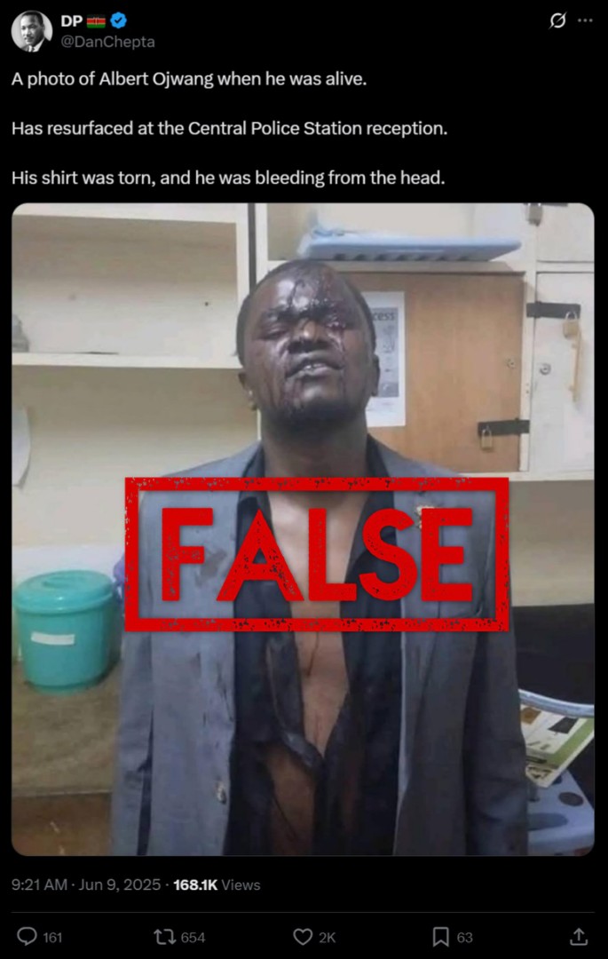 “صورة لألبرت أوجوانج عندما كان على قيد الحياة. عاد إلى الظهور في حفل استقبال مركز الشرطة المركزي. تمزق قميصه ، وكان ينزف من الرأس (كذا) ، “يقرأ X Post نشرت في 9 يونيو 2025 ، وشاركت أكثر من 600 مرة.