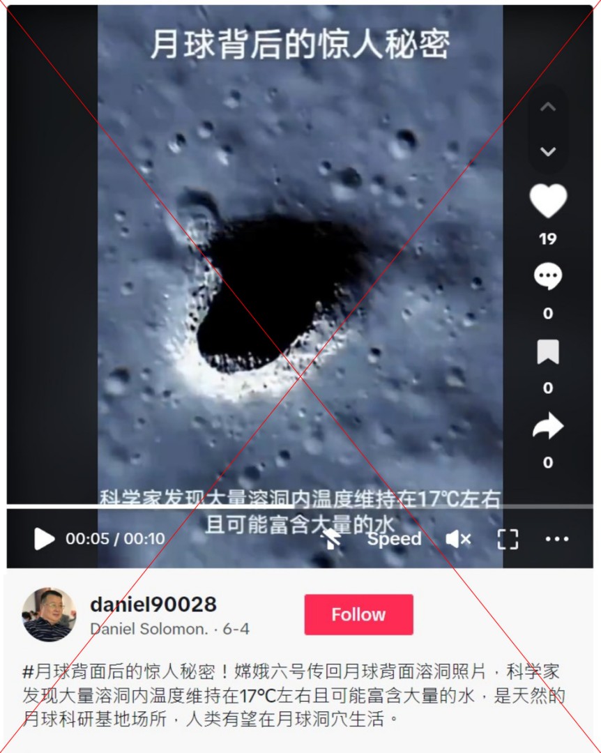 “تم الكشف عن أسرار مروعة للجانب البعيد من القمر! يرسل Chang'e-6 صورًا للكهوف على الجانب البعيد من القمر”، هذا ما جاء في العنوان الصيني المبسط لمقطع فيديو TikTok المنشور في 4 يونيو 2024.