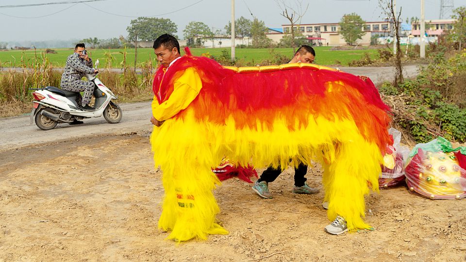 القرويون يرتدون رافعات ، والسكيد ، والأسود الأسطورية ، يطرحون صورًا تقف وسط المحاصيل أو في الأراضي الزراعية البور. يعرض فناني الأداء الأزياء في بيوت الطوب ضد الخلفيات الضبابية ، ويبدو أن عيون أقنعةهم ضائعة في الفكر. في حقل القمح الذي تم حصاده ، يصطف مجموعة من ما يقرب من عشرة رجال لعقد دمية تنين ملونة.