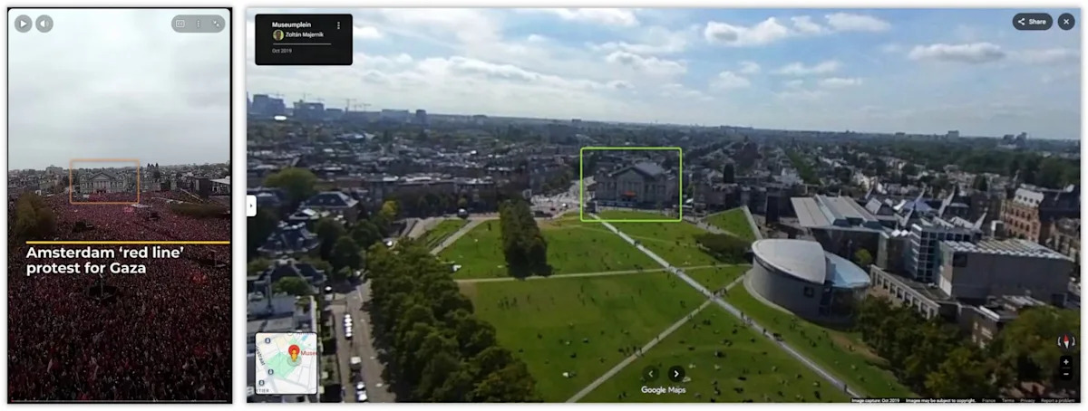 لقطات شاشة تقارن فيديو الجزيرة (يسار)، مع خريطة جوجل ستريت فيو لساحة أمستردام