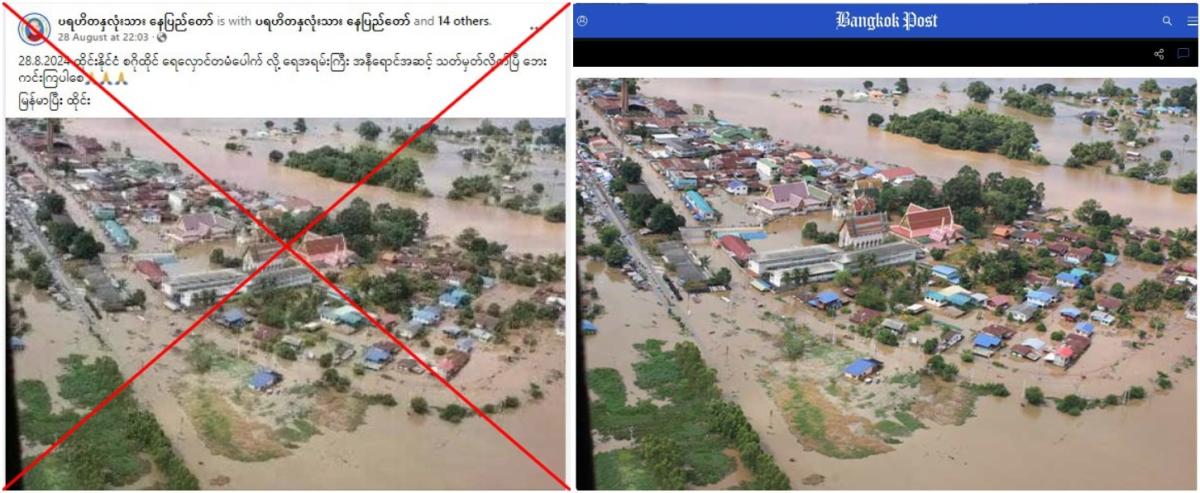 “كانت هناك فيضانات في ميانمار والآن في تايلاند”، هذا ما جاء في منشور على فيسبوك باللغة البورمية شارك الصور في 28 أغسطس/آب 2024.