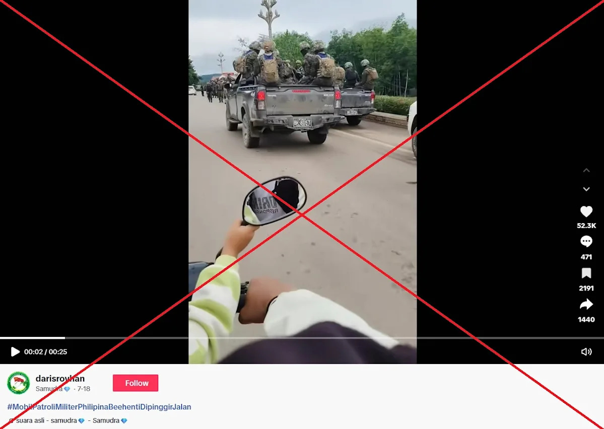 AFP أيضا عثر على مقطع فيديو مماثل للجنود الذين يتم قيادتهم على ظهر شاحنة بيك آب مشتركة على Tiktok منذ 18 يوليو 2025 مع تعليق باللغة الإندونيسية قائلة إنه يظهر “دورية عسكرية فلبينية”.