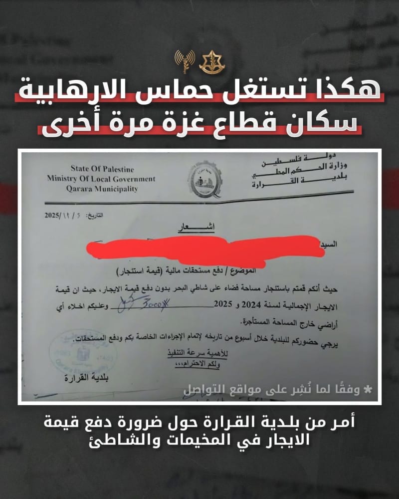 وكتب أدرعي في المنشور، الذي تضمن صورة حصل عليها الجيش لرسالة حماس تلخص طلب الحركة، “حماس تطالب السكان بدفع مبالغ ضخمة مقابل استئجار مساحة على الشاطئ”.