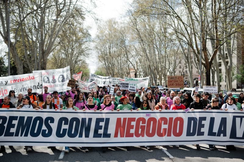 يشارك الناس في مظاهرة في مدريد للمطالبة بتدابير سياسية للتدخل في سوق الإسكان. بعد العديد من المظاهرات الجماعية في أجزاء مختلفة من إسبانيا ، دعت نقابات المستأجرين ومنصات الرهن العقاري والتجمعات ضد عمليات الإخلاء ، من بين مجموعات أخرى ، أول مظاهرة على مستوى الولاية للحق في الإسكان. Ignacio Lopez Isasmendi/Zuma Press Wire/DPA