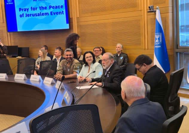 السفير الأمريكي لدى إسرائيل مايك هاكابي، عضو الكنيست تاتيانا مازارسكي، والمؤسس المشارك لمركز “عليا” حاييم مالسبان يحضرون يوم الصلاة في الكنيست في القدس، 26 نوفمبر 2025. (FELICE FRIEDSON/THE MEDIA LINE)