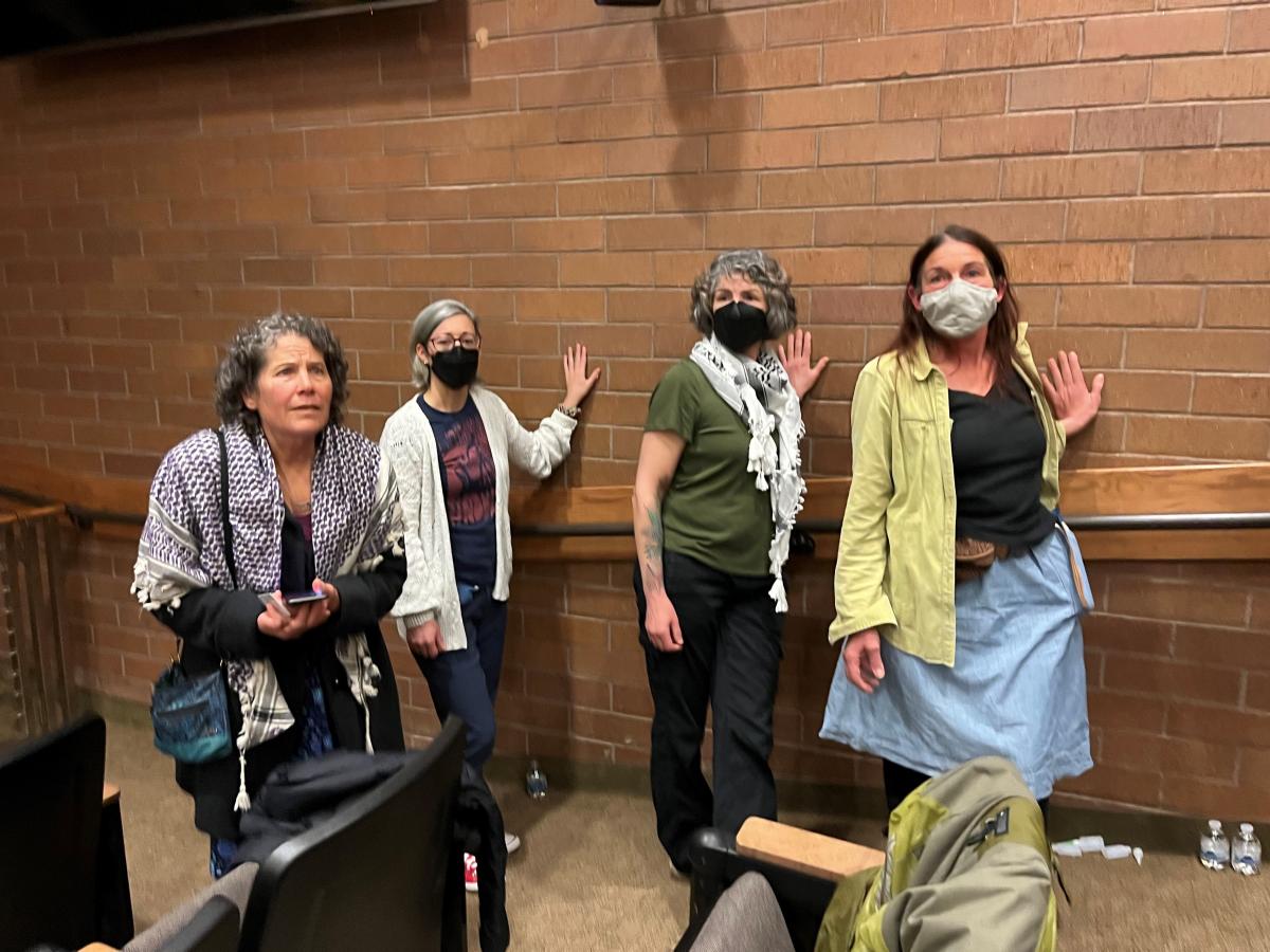 بينما كانت العمدة جيني أرندت تدلي بملاحظات حول السلوك أثناء التعليق العام، صاح أحد الأشخاص في المجلس: “هذا الاجتماع لن يتم تنظيمه”، وكان ذلك جزءًا من بيان قدمته النساء الثلاث للجمهور لقراءته بصوت عالٍ بمجرد الانتهاء من ذلك. لصقها أيديهم.