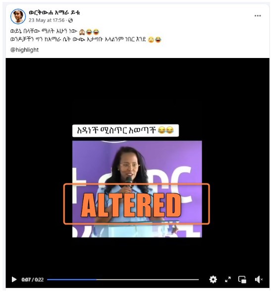 أخذ منشور False Facebook مقطعًا من خطاب Adanech الأصلي (من 4'02 “إلى 4'22”) ، وأبطأه قليلاً ، واستبدلت كلماتها بصوت تم إنشاؤه بواسطة الذكاء الاصطناعى.