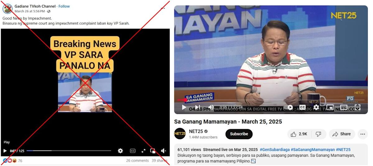 “لقد فازت أخبار Breaking News VP Sara” ، كما يقرأ نص اللغات التاجالوج على مقطع فيديو على Facebook مشترك في 26 مارس 2025.