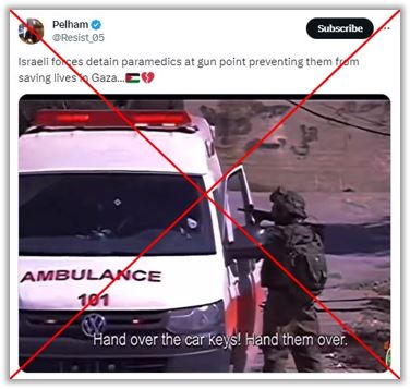 وانتقدت منظمات حقوق الإنسان إسرائيل لاستهدافها المرافق الصحية ومركبات الطوارئ في حربها ضد حركة حماس. لكن مقطع الفيديو الذي يظهر جنديًا يوقف سيارة إسعاف تحت تهديد السلاح لا علاقة له بنزاع 2023. وتم تصوير المقطع المنتشر عبر الإنترنت في الضفة الغربية المحتلة عام 2019.