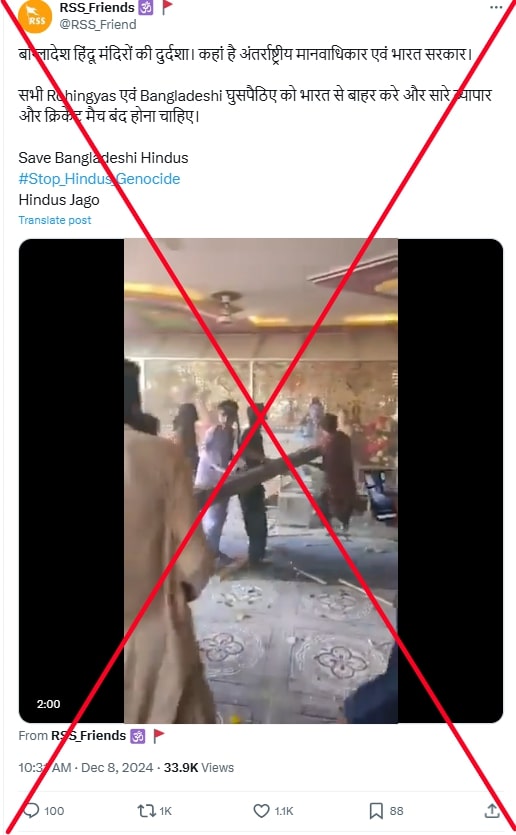 “محنة المعابد الهندوسية في بنغلادش. أين حقوق الإنسان الدولية والحكومة الهندية؟” اقرأ منشور X باللغة الهندية والذي شارك الفيديو في 8 ديسمبر.