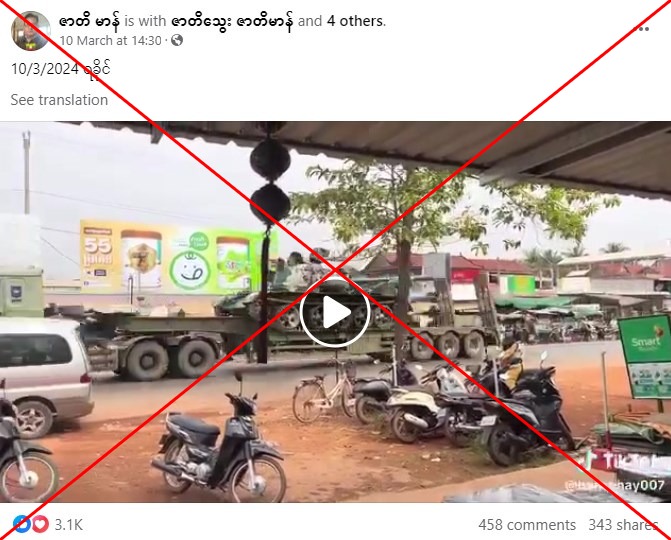 مع اشتداد القتال بين المجلس العسكري البورمي وقوات المتمردين العرقية، تمت مشاركة مقطع فيديو لدبابات يتم نقلها في كمبوديا مئات المرات على وسائل التواصل الاجتماعي مع ادعاء كاذب أنه تم التقاطه في ولاية راخين في ميانمار في مارس 2024. وتم نشر الفيديو على الإنترنت. قبل شهرين على الأقل وتم تصويره في أحد الأسواق في الجزء الجنوبي الغربي من كمبوديا.